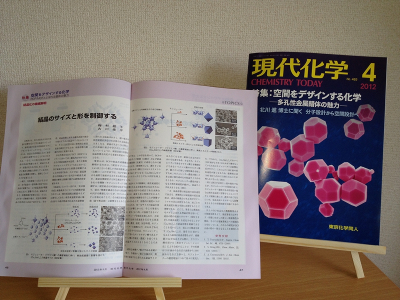 このテーマは学位取得後、京都大学の北川進教授率いるプロジェクトの一つ、科学技術振興機構(JST)ERATO北川統合細孔プロジェクトの博士研究員(ポスドク)として研究に従事することで、更に発展させ、錯体フレームワーク結晶の形態変化において新しい見解を導く事となった(写真下:東京化学同人様の月刊誌『現代化学』でも発表する機会を頂きました)。また、研究の傍ら、市民の皆さんにサイエンスの面白さを伝えることにも全力を注ぎ、それをきっかけとして、『今私が私であり私ゆえに皆の役に立てられる事は何か?』と自分に問い直す。